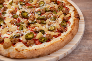 Hot Mexican DelightOriginal tomato sauce, mozzarella cheese, pepperoni, sausage, pineapple, jalapeno and red crushed pepper.